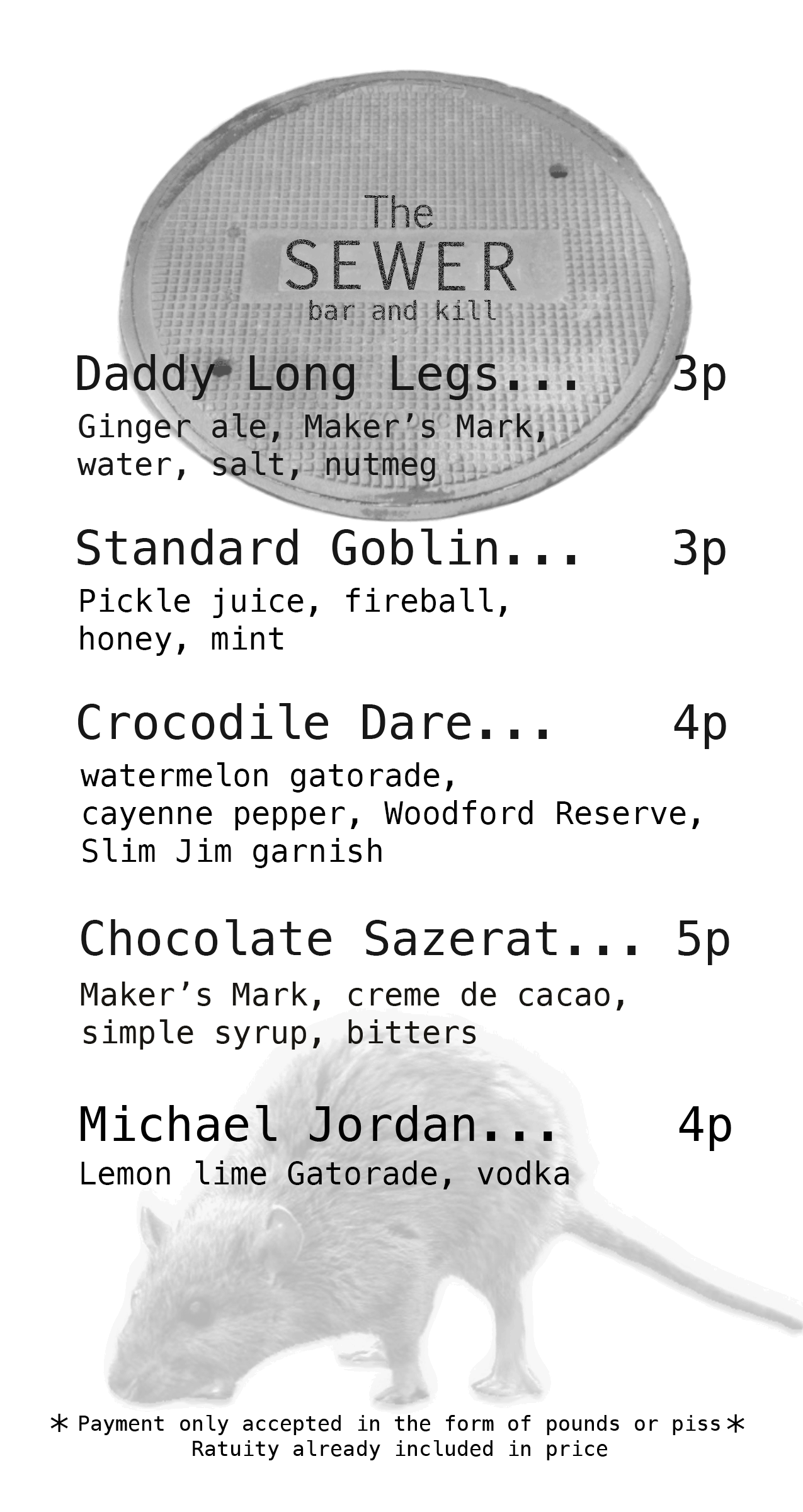 Every year for the past fourteen years my two friends and I (who happen to be creative directors) descend deep into the wilderness to worship our deity, The Rat God, for four days and nights. Here is a menu that I made (filled with inside jokes) designed to quench our thirst for savagery while practicing our First Amendment Rights. Drink up, suckers.